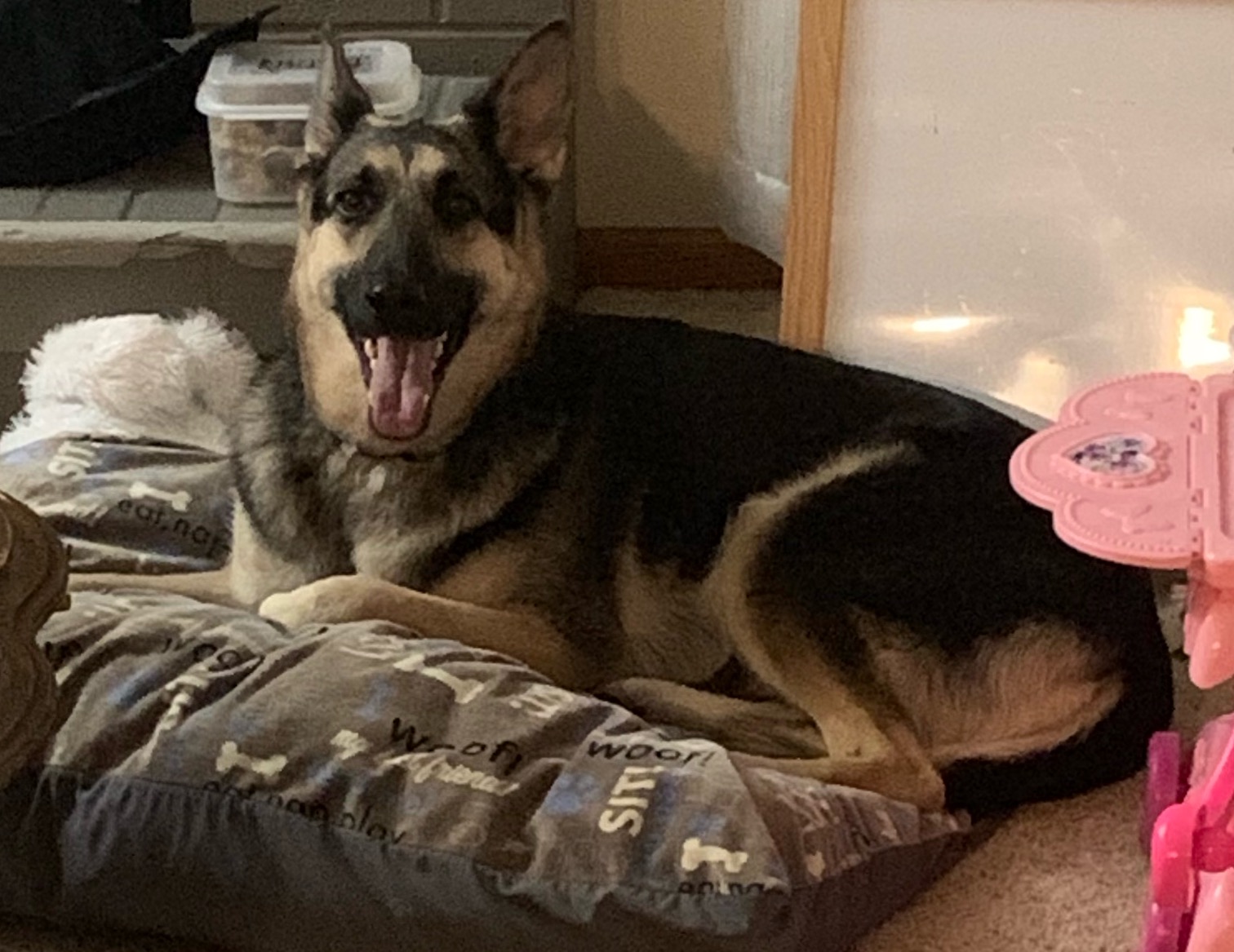 Molly is a 2-year old GSD we adopted from German Shepherd Rescue of Iowa (GSDRI.org). She was surrendered by a breeder in Oklahoma. She was not well taken care of. When the rescue got her she was covered in fleas and ticks and was scared of anything outside of her crate, including light. She wouldn't eat, drink, pee/poo, etc. if the lights were on. She was afraid of any sound. She did not enjoy the company of people. She is a very small GSD. Her growth was likely stunted by being bred too early. I think that probably preventer her from being bred again and led to her surrender. The wonderful foster who took her in worked pretty hard to build up Molly's trust enough to have her do things like come out of her crate, eat outside of the crate, eat with the lights on, go outside, and letting the foster and eventual others actually pet her without violently recoiling. When Molly moved in with us she had some regression the first few days. Last night she spent the entire evening in our living room with us alternating between pets from myself and the wife. I think she has accepted us (the kids included) as her people and is ok with her new home. She is still neurotic AF and we have some work to do together still, but I think she is a wonderful pup.