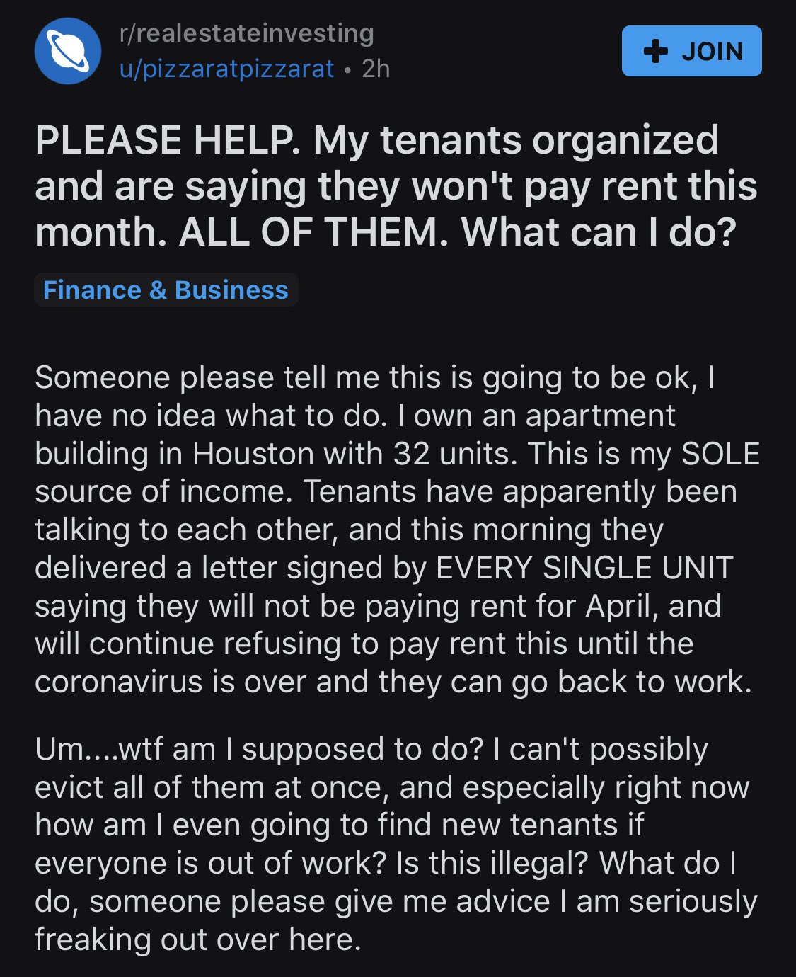 @macmanx thanks for that. Also, this is me. Unemployed since 2015, unable to get another job in the industry I spent the prior 22 years in, I've been living off of a couple buildings I bought with my life savings. Finally took a HUGE fucking risk & borrowed a couple million to build a 16 unit apartment building. It will be the only source of income for feeding my kids & paying our utilities, etc. I can't imagine the government will waive my obligations to the giant bank that granted us the loan, but I'm 100% sure they will waive tenants obligations to pay rent. I'm not price gouging or evicting people, I'm not being in any way shitty, but I'm definitely gonna be in really bad shape here. Building is miraculously still under construction, hopefully (but doubtfully) things will improve come summer when it's finished.