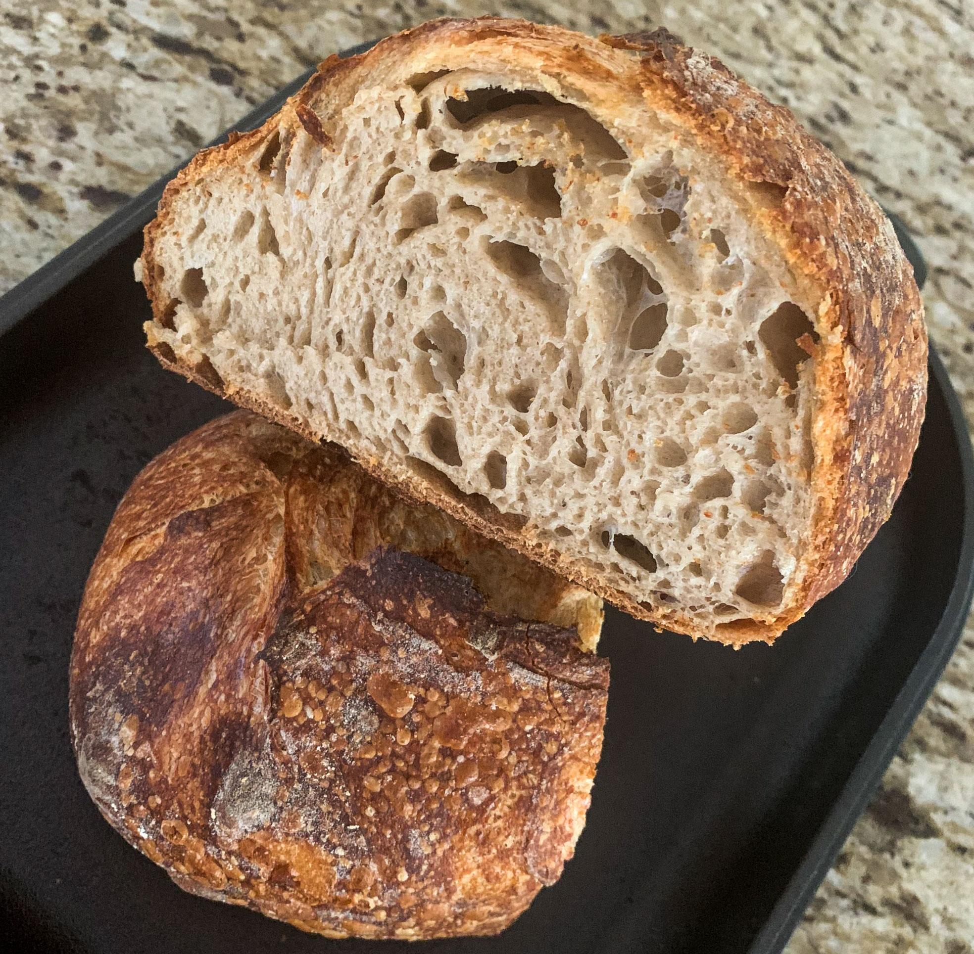 Upped the water to 330g, upped the starter to 70g. Much higher percentage of bread flour as I was able to get 5# of really good stuff (Ardent Mills High Gluten Bread flour) from my local bakery. Used a lot less flour in the banneton which resulted in great blisters all over the crust. And I sprung for the expensive but fairly amazing Challenger Bread Pan which really made a huge difference.