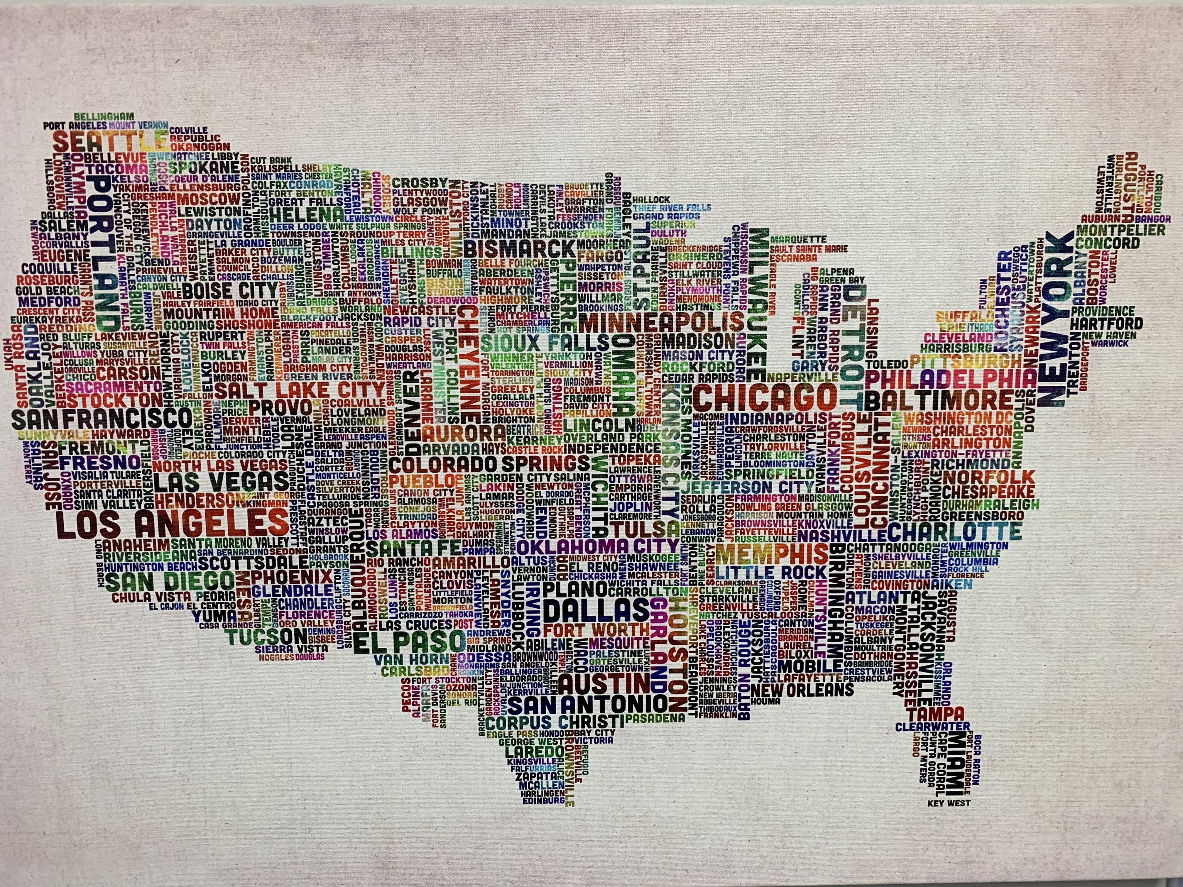 Wordle/map of mainland USA showing city size