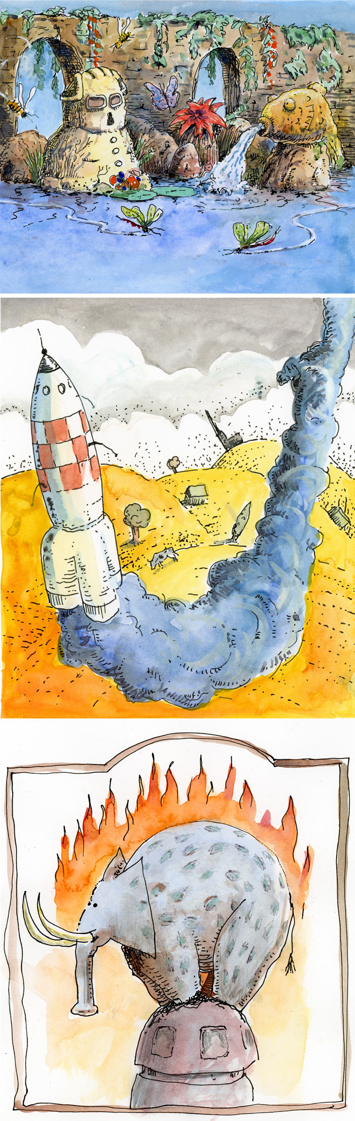 I never go back afterwards. Everything is on the spot, no sketching, no pencil lines to help me, no erasers. Mistakes have to be accepted and reworked into something else. Those rules make it easier for me, as a matter of fact :-)