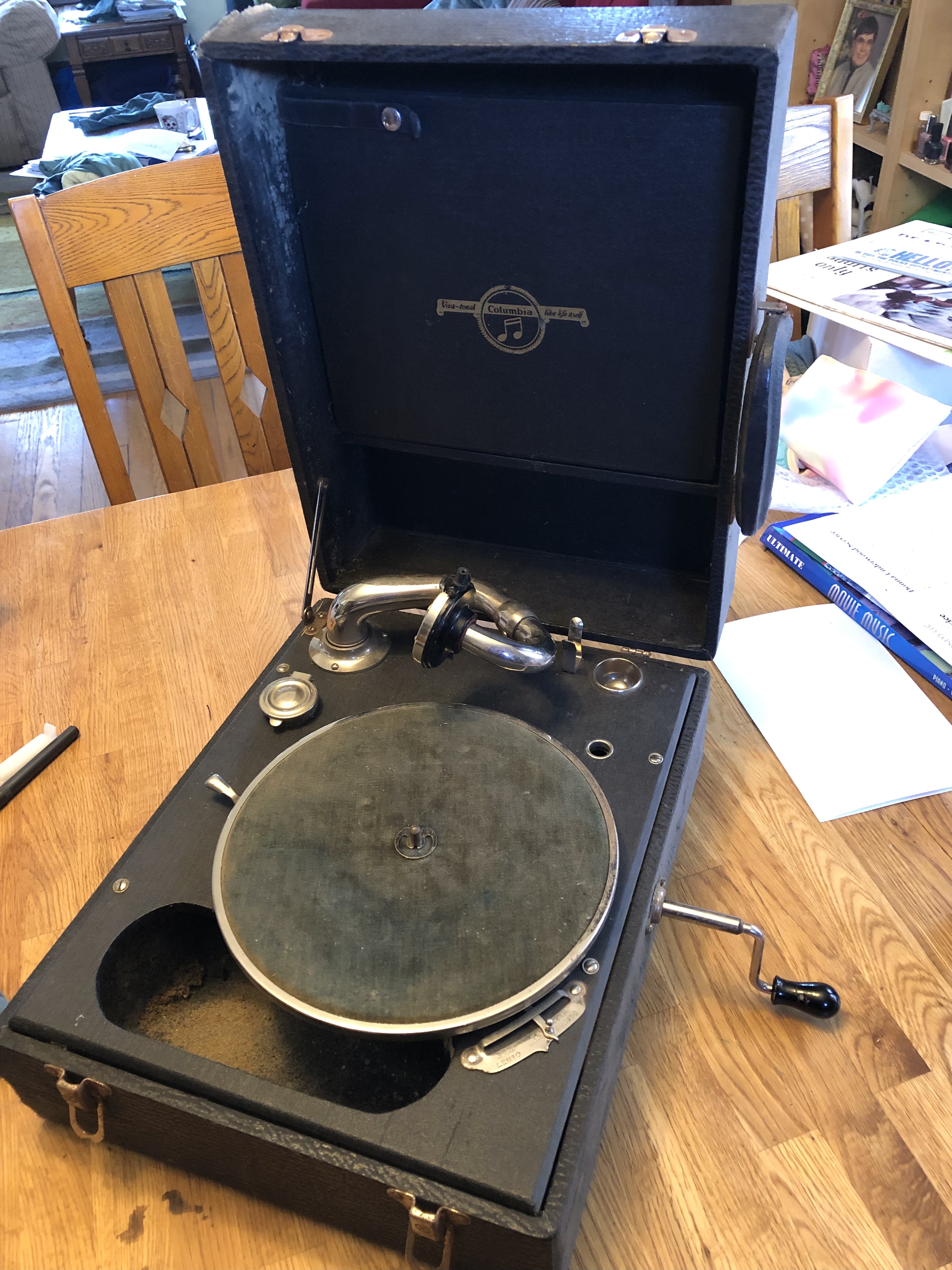 No idea what it is yet, exactly, other than the Columbia logo in the lid. It appears to be complete aside from a missing screw for the needle holder, and hopefully just needs a good cleaning and lube.