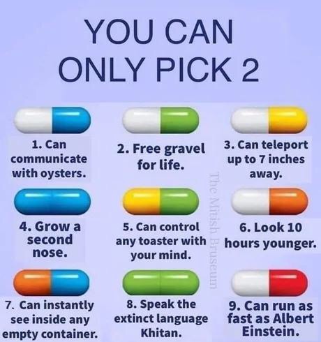 7 is my top pick, being able to know a container is empty just by looking at it would be cool but possibly useful, picking between 2 and 3 is a struggle for me. Teleporting 7 inches could potentially be lifesaving, but on the flip side, free gravel for life? Tough choice....