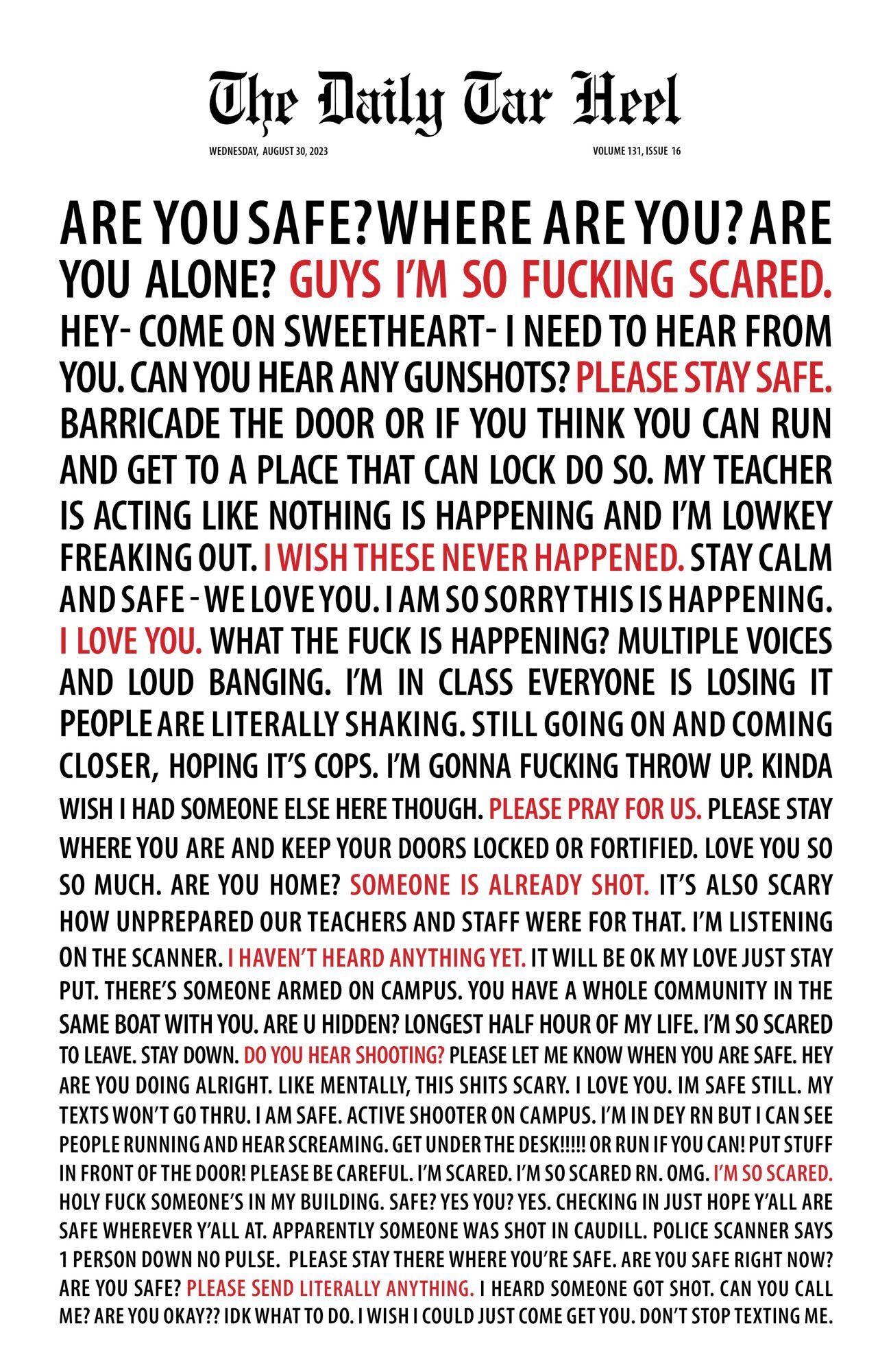 ARE YOU SAFE? WHERE ARE YOU? ARE YOU ALONE? GUYS I'M SO FUCKING SCARED. HEY-COME ON SWEETHEART- I NEED TO HEAR FROM YOU. CAN YOU HEAR ANY GUNSHOTS? PLEASE STAY SAFE. BARRICADE THE DOOR OR IF YOU THINK YOU CAN RUN AND GET TO A PLACE THAT CAN LOCK DO SO. MY TEACHER IS ACTING LIKE NOTHING IS HAPPENING AND I'M LOWKEY FREAKING OUT. I WISH THESE NEVER HAPPENED. STAY CALM AND SAFE - WE LOVE YOU. I AM SO SORRY THIS IS HAPPENING. I LOVE YOU. WHAT THE FUCK IS HAPPENING? MULTIPLE VOICES AND LOUD BANGING. I'M IN CLASS EVERYONE IS LOSING IT PEOPLE ARE LITERALLY SHAKING. STILL GOING ON AND COMING CLOSER, HOPING IT'S COPS. I'M GONNA FUCKING THROW UP. KINDA WISH I HAD SOMEONE ELSE HERE THOUGH. PLEASE PRAY FOR US. PLEASE STAY WHERE YOU ARE AND KEEP YOUR DOORS LOCKED OR FORTIFIED. LOVE YOU SO SO MUCH. ARE YOU HOME? SOMEONE IS ALREADY SHOT. IT'S ALSO SCARY HOW UNPREPARED OUR TEACHERS AND STAFF WERE FOR THAT. I'M LISTENING ON THE SCANNER. I HAVEN'T HEARD ANYTHING YET. IT WILL BE OK MY LOVE JUST STAY PUT. THERE'S SOMEONE ARMED ON CAMPUS. YOU HAVE A WHOLE COMMUNITY IN THE SAME BOAT WITH YOU. ARE U HIDDEN? LONGEST HALF HOUR OF MY LIFE. I'M SO SCARED TO LEAVE. STAY DOWN. DO YOU HEAR SHOOTING? PLEASE LET ME KNOW WHEN YOU ARE SAFE. HEY ARE YOU DOING ALRIGHT. LIKE MENTALLY, THIS SHITS SCARY. I LOVE YOU. IM SAFE STILL. MY TEXTS WON'T GO THRU. I AM SAFE. ACTIVE SHOOTER ON CAMPUS. I'M IN DEY RN BUT I CAN SEE PEOPLE RUNNING AND HEAR SCREAMING. GET UNDER THE DESK!!!!! OR RUN IF YOU CAN! PUT STUFF IN FRONT OF THE DOOR! PLEASE BE CAREFUL. I'M SCARED. I'M SO SCARED RN. OMG. I'M SO SCARED. HOLY FUCK SOMEONE'S IN MY BUILDING. SAFE? YES YOU? YES. CHECKING IN JUST HOPE Y'ALL ARE SAFE WHEREVER Y'ALL AT. APPARENTLY SOMEONE WAS SHOT IN CAUDILL. POLICE SCANNER SAYS 1 PERSON DOWN NO PULSE. PLEASE STAY THERE WHERE YOU'RE SAFE. ARE YOU SAFE RIGHT NOW? ARE YOU SAFE? PLEASE SEND LITERALLY ANYTHING. I HEARD SOMEONE GOT SHOT. CAN YOU CALL ME? ARE YOU OKAY?? IDK WHAT TO DO. I WISH I COULD JUST COME GET YOU. DON'T STOP TEXTING ME.