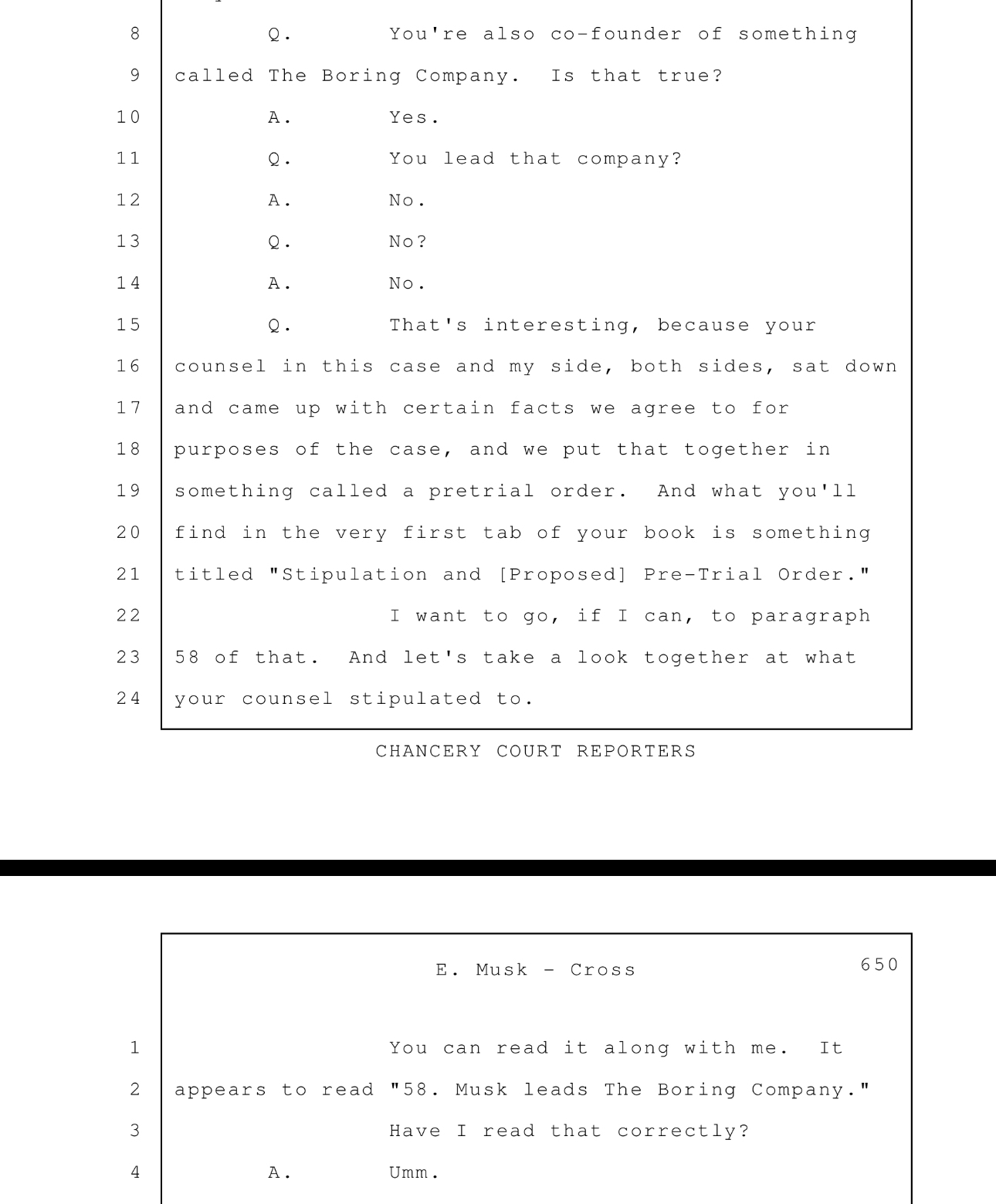 Q: That's interesting because [your counsel] sat down and came up with certain facts we agree to for purpose of this case.... I want to go, if I can, to paragraph 58 of that. And let's take a look together at what your counsel stipulated to. You can read it along with me. It appears to read "58. Musk leads The Boring Company." Have I read that correctly?