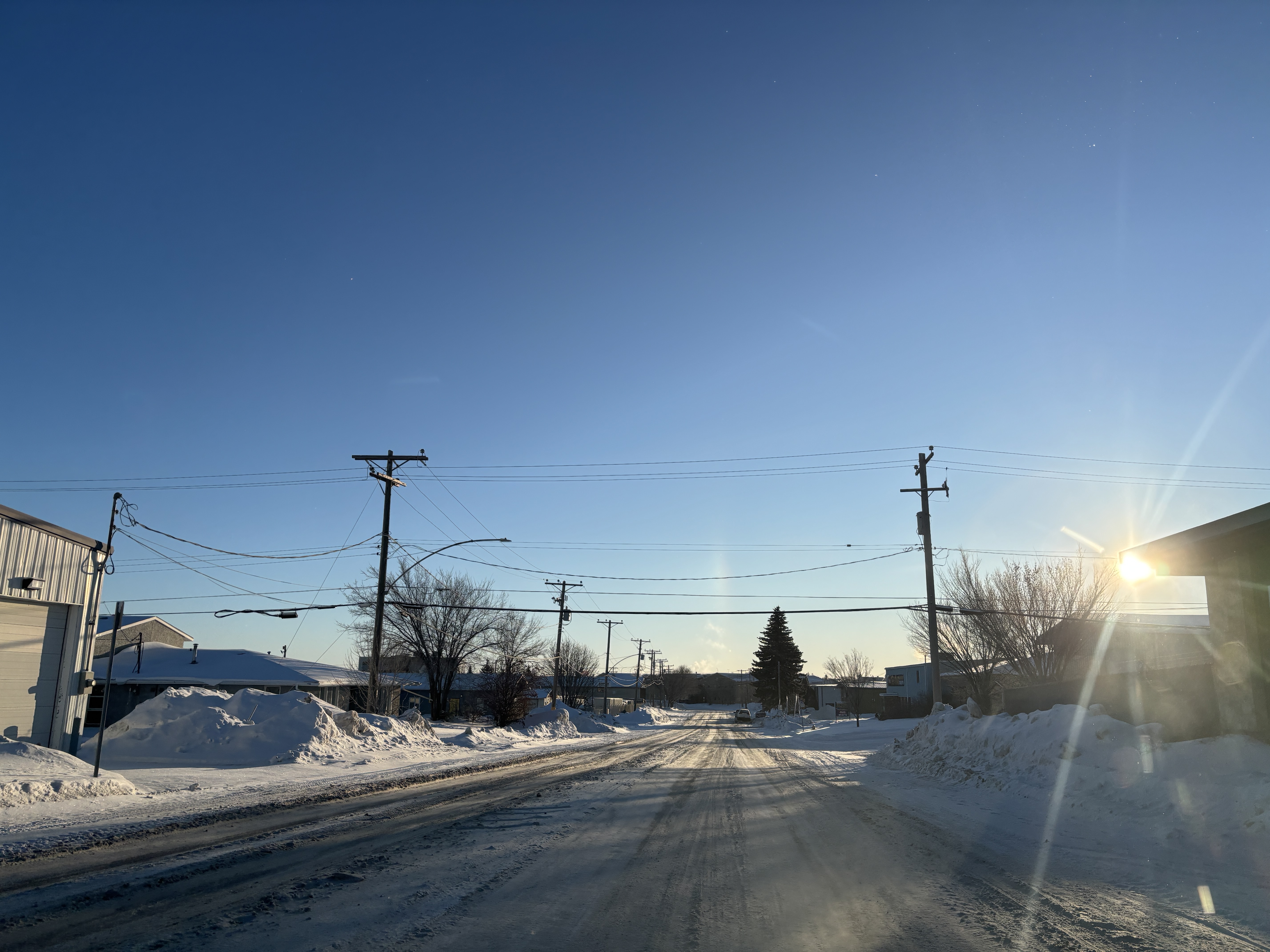 Morning in winter. The sky is clear and blue. A snowy city road is leads between two buildings on either side, power poles on either side. The sun is in the low to mid right of the picture, and a sun dog is visible in almost the exact centre.