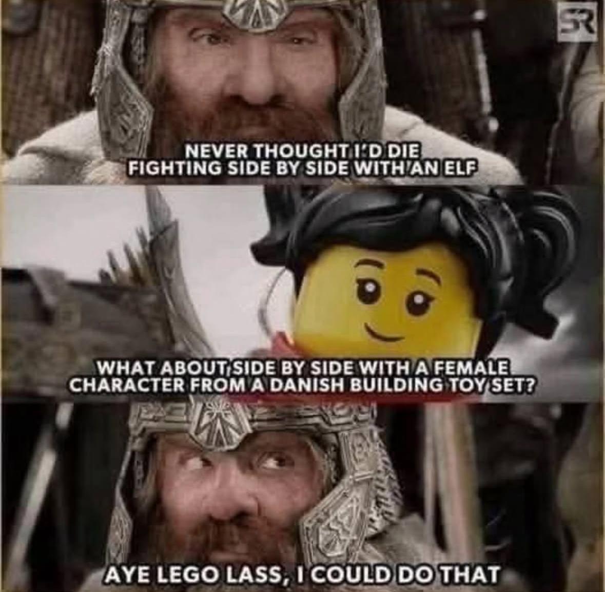 Three panel meme. Top panel is Gimli from Lord of the Rings saying “Never thought I’d die fighting side by side with an elf”. Middle panel is a Lego figure saying “what about side by side with a female character from a Danish building toy set” bottom panel is Gimli saying “Aye Lego Lass, I could do that”
