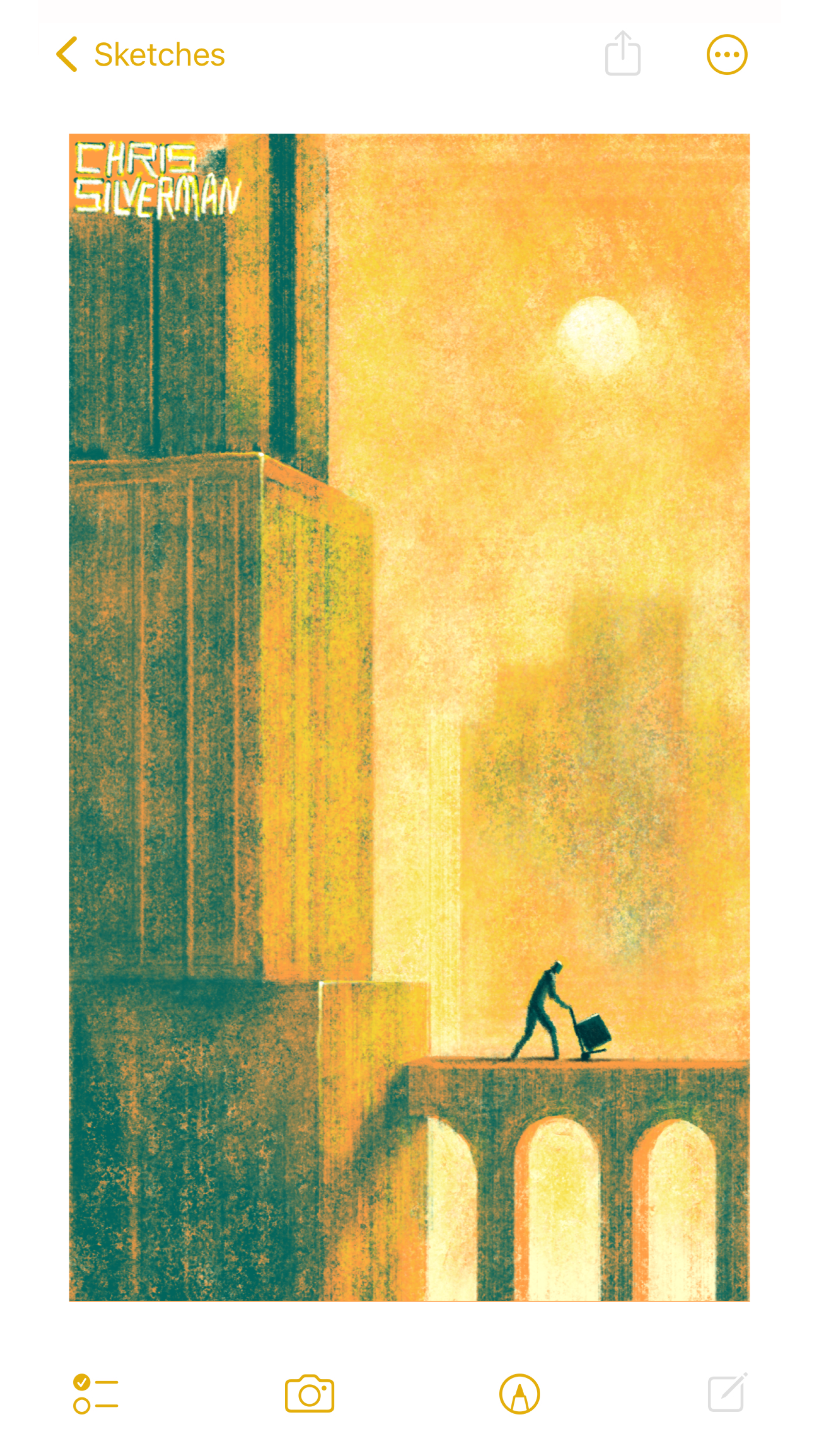A hot, yellow sky hovers over a strange city made of boxes. The boxes have no windows and one is arranged at an angle. A bridge with arches, similar to an aqueduct, extends away from one of the buildings. Walking along the bridge is a small figure pushing a dolly with a small package on it. A washed-out white sun hangs in the sky. The painting is signed "Chris Silverman".