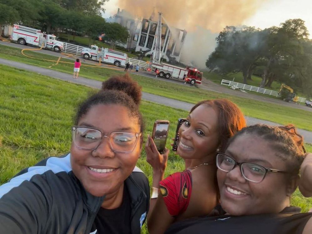A selfie, showing three young Black women, two of them possibly teenagers, standing in a grassy field. In the background, three firetrucks are parked in front of a burning white mansion, being sprayed with water from one of them. The women are all grinning delightedly at the camera.