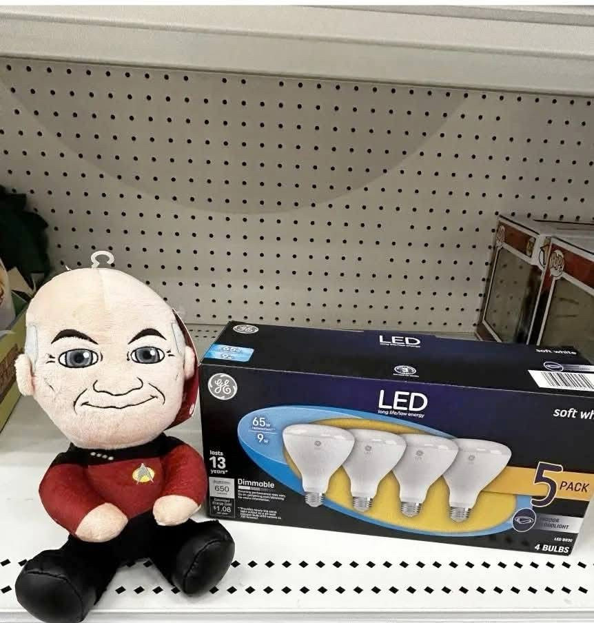 A stuffed doll of Jean-Luc Picard, captain of the starship Enterprise in the television program Star Trek: The Next Generation, sits on a shelf in a used goods store right next to a packaged of LED lights. The picture on the front of the box show four lights while the written advertising on the box says there are FIVE lights in the package.