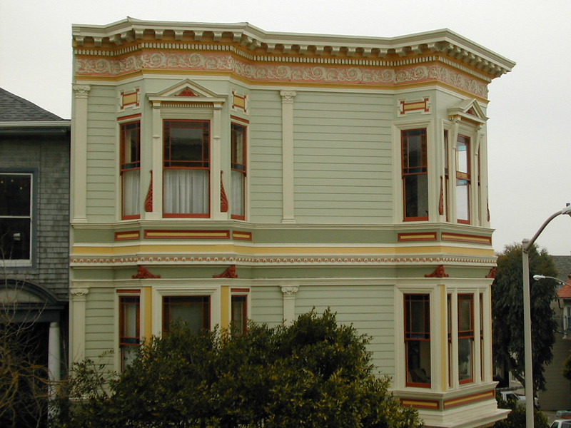 Edwardian-style apartment building in SF with a fresh paint job, but the photo is a dull overcast poorly color-corrected unedited dump from a little digicam.