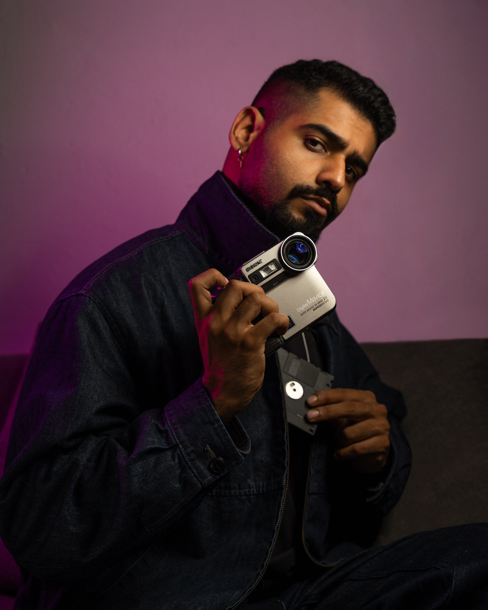 A photograph of a man holding a vintage digital camera and pulling a 3.5" floppy disk from inside of his denim jacket.