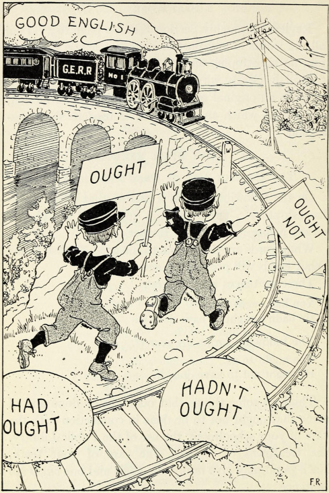 Illustration of a train dragging a “GOOD ENGLISH” banner over a bridge, on the other side of which boys waving flags “ought” and “ought not” flags are trying to wave